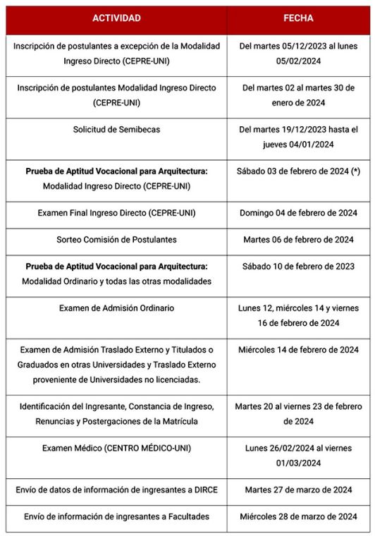 - Postulaciones por Ingreso directo del Centro Preuniversitario de la UNI (Cepre-UNI), incluido la sede Juliaca (Puno)