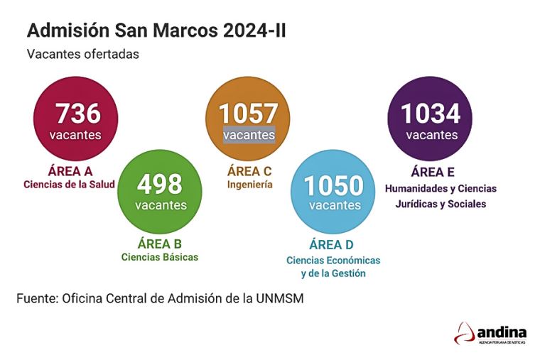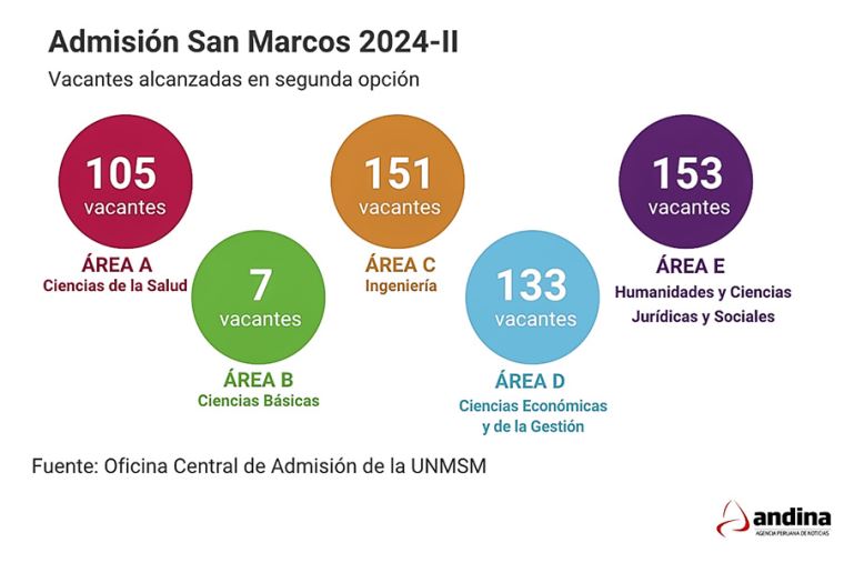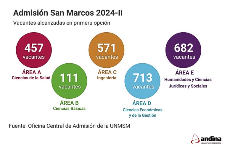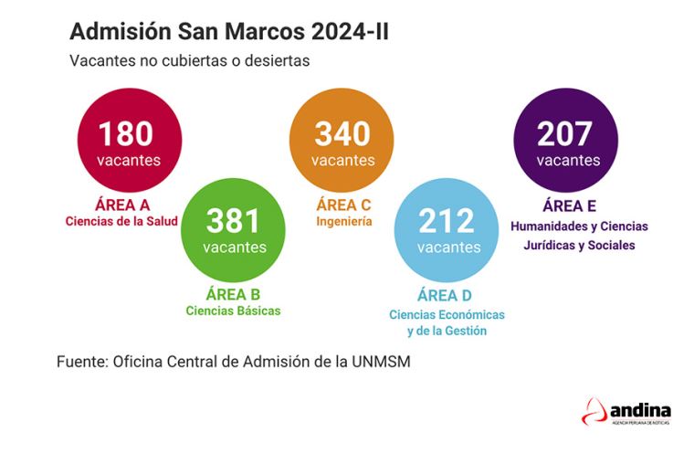 [Lea también: Ejecutivo garantiza el fortalecimiento de la seguridad y reactivación]Luego de cuatro intensas jornadas de evaluación, la Oficina Central de Admisión (OCA) de la Universidad Nacional Mayor de San Marcos (UNMSM) presentó el balance general del examen de admisión 2024-II. El informe detalla el número de postulantes que lograron una vacante en cada área académica, así como las plazas que quedaron desiertas.