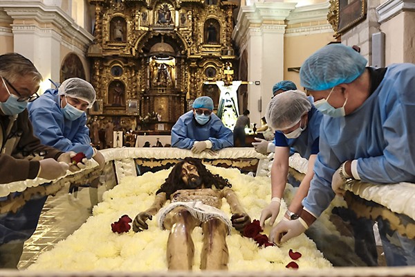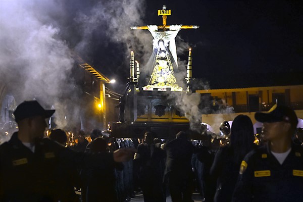 La plaza Mayor de Huamanga estuvo abarrotada de turistas nacionales y extranjeros, que quedaron impresionados con la procesión que representa a Jesús tras su crucifixión.