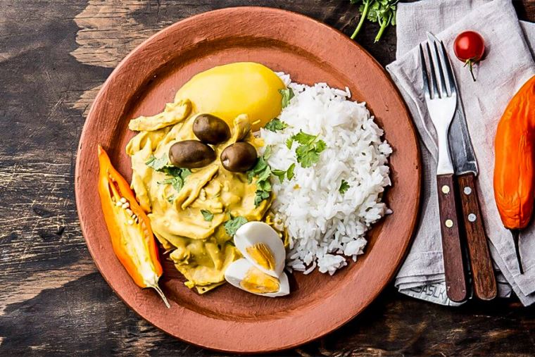 El ají de gallina es un plato picante que consiste en pollo desmenuzado en una salsa cremosa. Se sirve típicamente con una porción de arroz y se adorna con aceitunas negras y papas hervidas.
