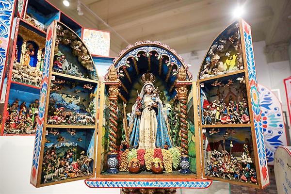 Añadió que los retablos, cuyas puertas de madera están pintadas de blanco con elementos de colores “son un soporte muy flexible que se produce de manera comercial”, y al mismo tiempo también para albergar nuevas expresiones artísticas e incluso políticas.