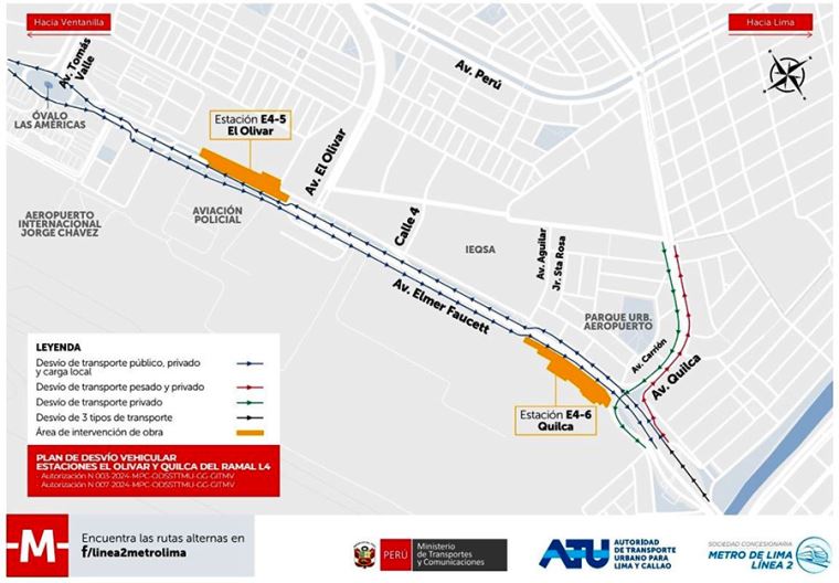 La Autoridad de Transporte Urbano para Lima y Callao (ATU) aseguró que esta medida no afectará la circulación en ambos sentidos. El plan de desvío, elaborado por la Sociedad Concesionaria Metro de Lima Línea 2 S. A. y autorizado por la Municipalidad Provincial del Callao, contempla trabajos de construcción a la altura del puente Aduanas (frente al Centro Aéreo Comercial) y la av. Quilca.