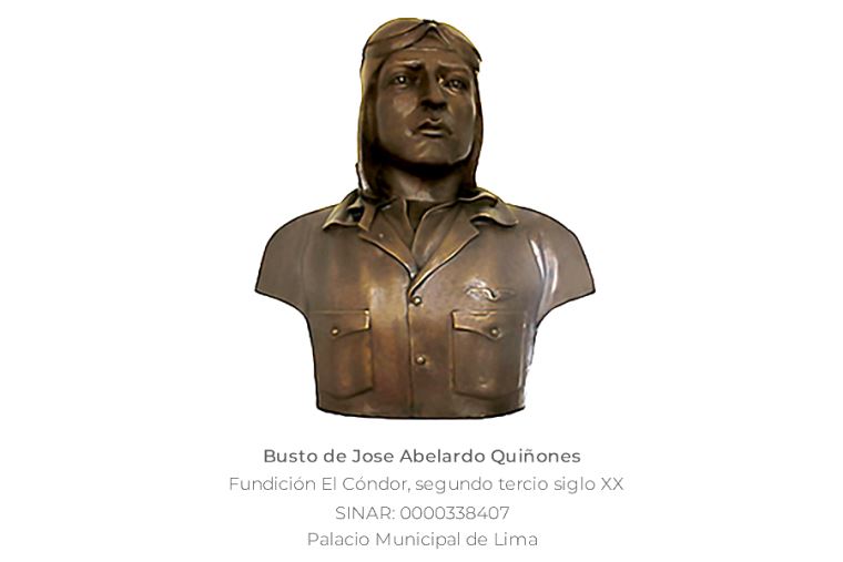 Hecha en bronce y de estilo académico, muestra a Quiñones con su uniforme de aviación. Se encuentra en el Palacio Municipal de Lima (Jirón de la Unión 300, Cercado de Lima).