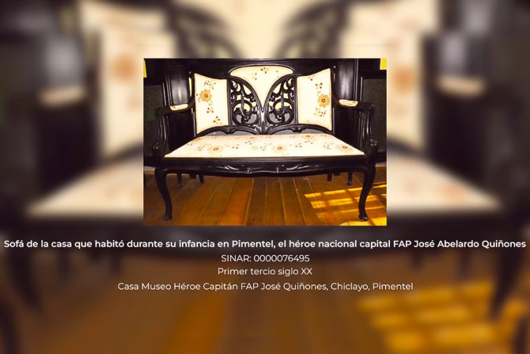 Este sofá forma parte del mobiliario distribuido en diversos ambientes de la casa que habitó durante su infancia en Pimentel, el héroe nacional capital FAP José Abelardo Quiñones, y que nos permiten acercarnos a la vida de Quiñones en el hogar, a principios del siglo XX.