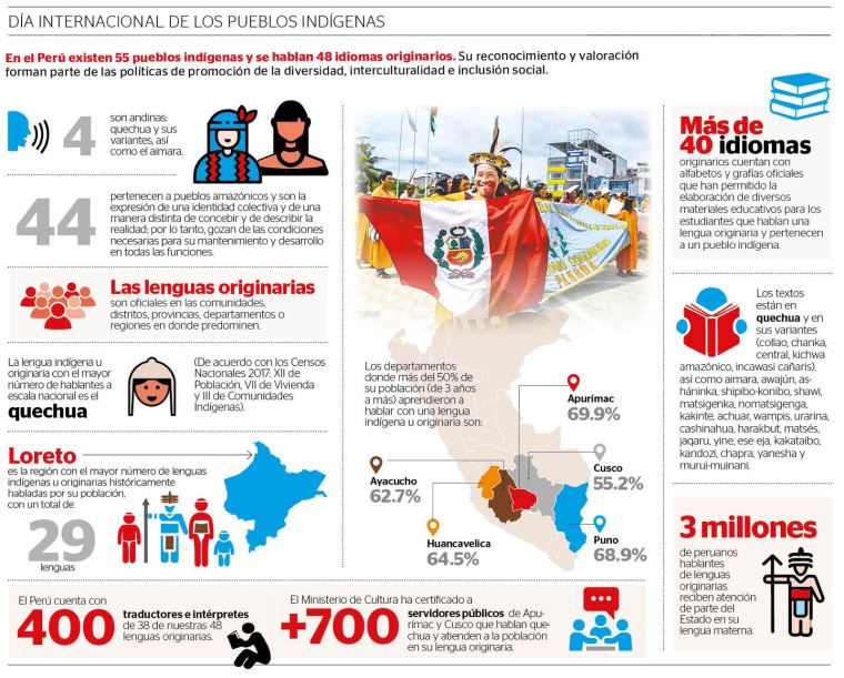 El Estado, mediante el Ministerio de Cultura, trabaja para que todas las instituciones públicas ubicadas en las zonas donde se hable una lengua originaria puedan atender en ese idioma a la población local. Con ese objetivo, despliega un trabajo de formación de los servidores públicos bilingües.