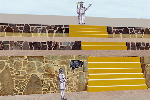 Para Palacios, el petroglifo colocado corresponde a una ceremonia de abandono y cierre del recinto. Maneja la hipótesis que por su forma era parte de la entrada principal a la plaza hundida.