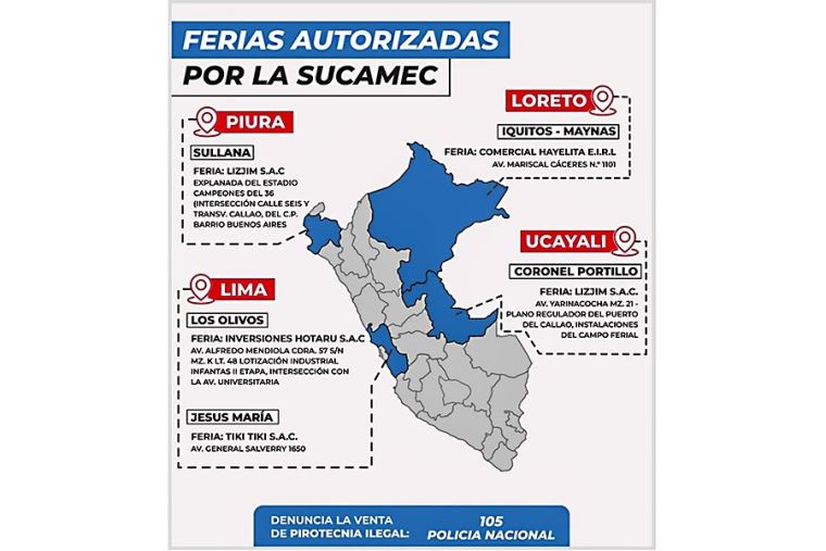 Precisó que dicha autorización fue aprobada tras corroborarse que estas ferias cumplen con los estándares de seguridad y calidad, y garantizan que los productos pirotécnicos que se ofrecerán al público son los permitidos, conforme la normativa actual, Ley N°30299.