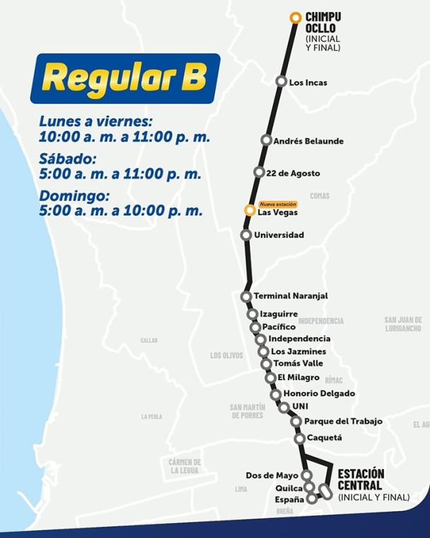 Los usuarios que inicien su viaje desde la estación Las Vegas o de otra estación del Metropolitano deben saber que la Ruta B va desde Chimpu Ocllo hasta la estación Central (frente a Palacio de Justicia), tal como se detalla en la siguiente imagen: