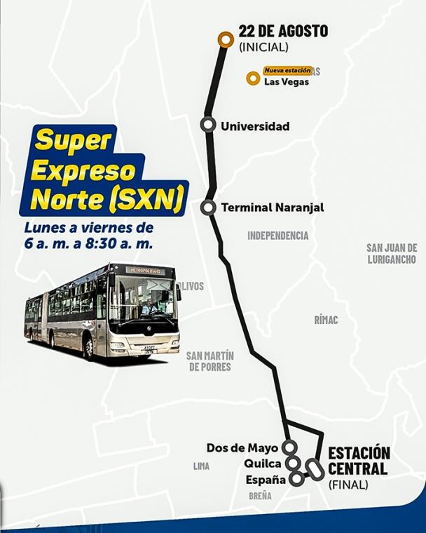 En tanto, el Súper Expreso Norte inicia su recorrido desde 22 de Agosto, se detiene en Las Vegas, Universidad, Naranjal, Dos de Mayo, Quilca, España y finaliza en la estación Central.