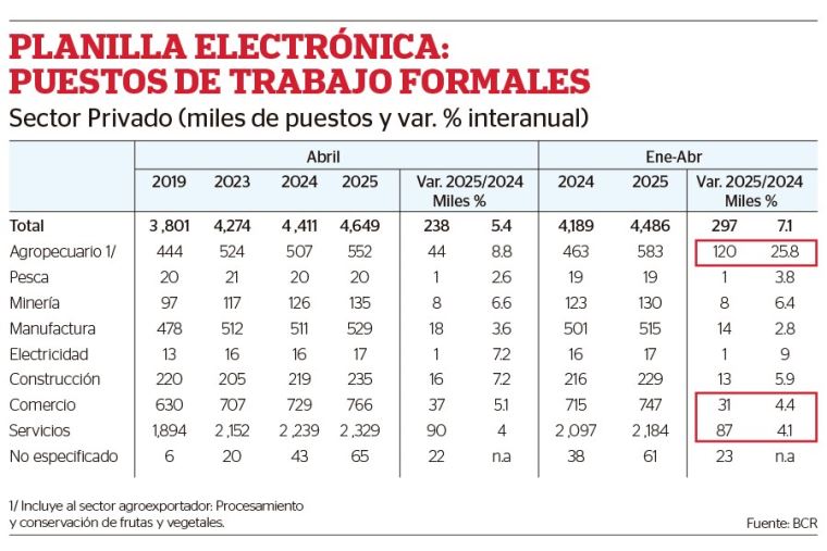 En ese sentido, el ente emisor destaca que el empleo formal total (público y privado) en el Perú creció 5.5% en el periodo enero-abril de este año, respecto al similar lapso del 2024.