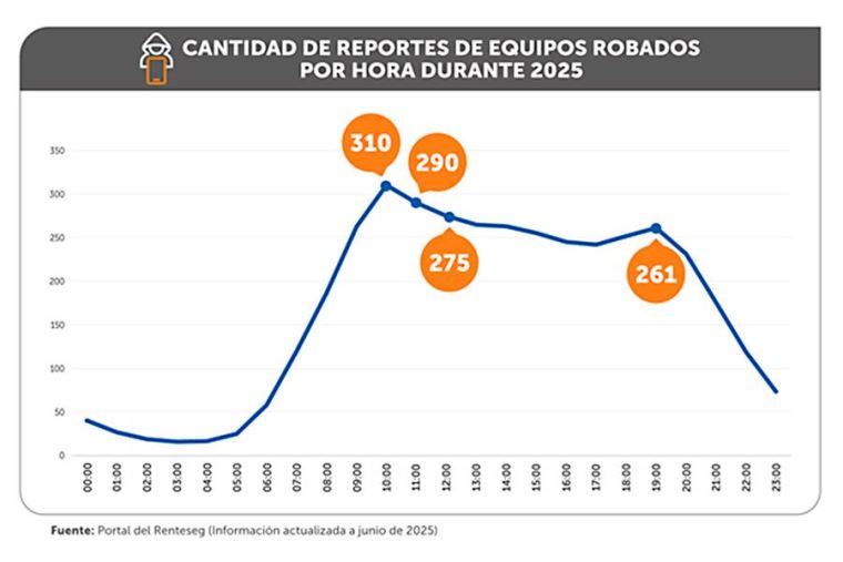 Según información brindada por las empresas operadoras al Osiptel, la hora con mayor número de robos es las 10:00 horas (310 celulares diarios en promedio), seguida de las 11:00 horas (290), mediodía (275) y otro pico alto es a las 19.00 horas (261).