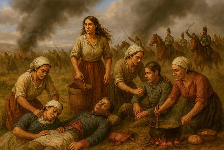 En el caso de las Rabonas, estas fueron mujeres que acompañaban a los soldados en la campaña, desempeñando un papel logístico importante. No solo se encargaban de la alimentación, el lavado de la ropa y la atención a los heridos, sino que eran también portadoras de mensajes y noticias.