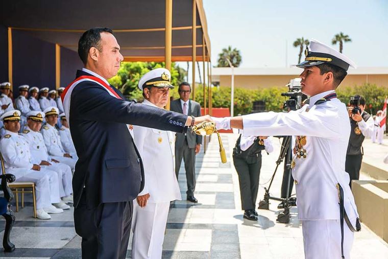 "Públicamente, ratificamos nuestro compromiso de fortalecer esta histórica institución, con presupuesto, equipamiento y tecnología que incida en la preparación de los peruanos que aquí se forman", dijo el mandatario durante la ceremonia de graduación de los alféreces de fragata de la Escuela Naval del Perú.
