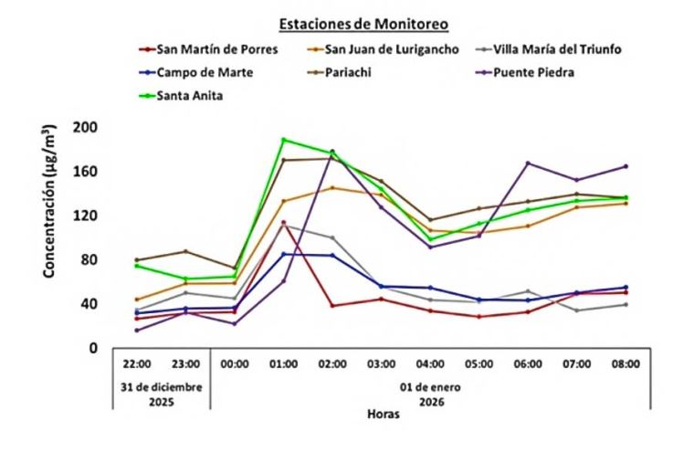 Las estaciones de la Red de Monitoreo Automático de la Calidad del Aire (REMCA) registraron concentraciones elevadas de contaminantes en diversos distritos de Lima Metropolitana, principalmente entre las 01:00 y las 08:00 horas del 1 de enero.