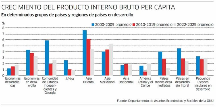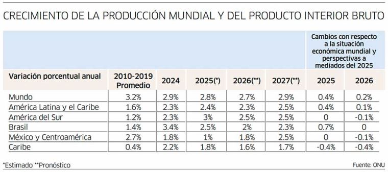 De acuerdo con el estudio de la ONU, se prevé que la producción mundial crezca 2.7% el 2026, ligeramente por debajo del 2.8% estimado para el 2025 y muy por debajo del promedio prepandemia de 3.2%.