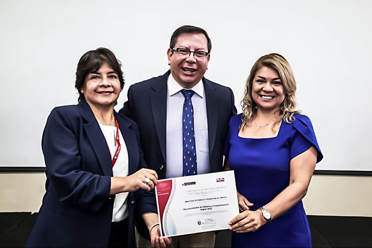 En representación del ministro Óscar Fernández Cáceres, la secretaria general del MTPE, Teresa Velásquez, recibió la distinción que reconoce los avances del sector en la implementación del Gobierno y la Transformación Digital, evidenciados en el cumplimiento de acciones clave del marco normativo vigente.