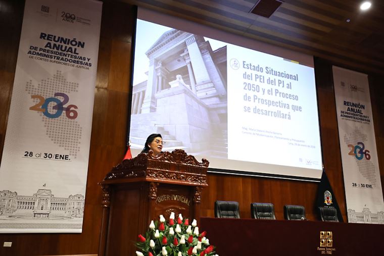 Por su parte, la gerente de Modernización, Planeamiento y Presupuesto del Poder Judicial, María Peche Becerra, presentó el 'Estado Situacional del Plan Estratégico Institucional (PEI) del Poder Judicial al 2050 y el Proceso de Prospectiva'.