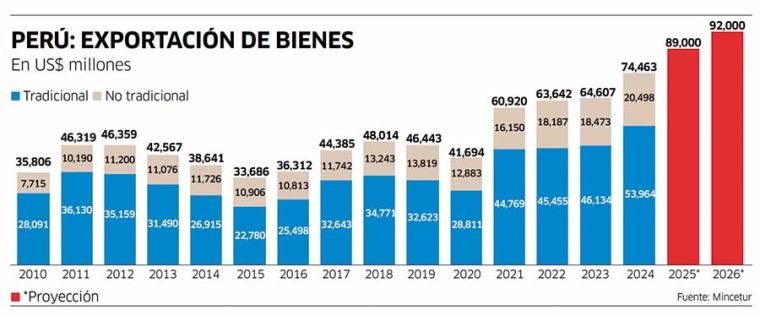 Proyecta que este año Perú registrará un récord exportador por sexto año consecutivo con envíos por más de 92,000 millones de dólares.