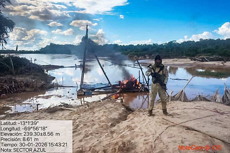 Como resultado de la intervención, se destruyeron campamentos clandestinos, balsas dragas, motocargueros, motores, generadores eléctricos, combustibles y otros materiales empleados en la minería ilegal, valorizados en más de S/13 millones.