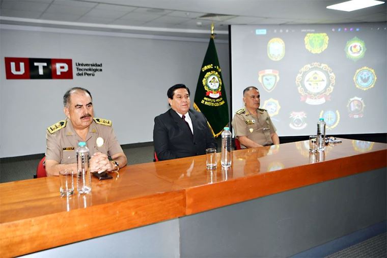En la conferencia, realizada en el auditorio de la Universidad Tecnológica del Perú (UTP), en el Cercado de Lima, el ministro estuvo acompañado del coordinador general de los Programas Académicos en Investigación Criminal, Gral. PNP Ántero Mejía, y el director del Instituto Policial de Investigación Criminal, Crnl. PNP Engels De Tomas Vicente.