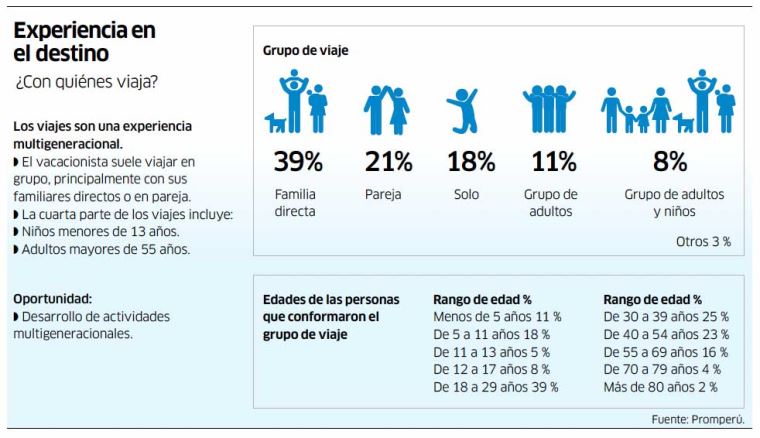 Adicional a ello, seis de cada diez peruanos emprendió el viaje por cuenta propia. El 69% de los vacacionistas escogió viajar en grupos pequeños, acompañados por su familia directa o por su pareja.