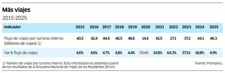 Promperú proyecta 49.7 millones de viajes por turismo interno para el 2026, lo que implicaría un crecimiento de 7.34%, en comparación con lo registrado en el 2025, cuando se registraron 46.3 millones de viajes.