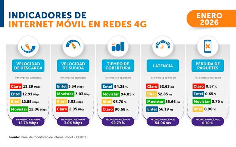 En el desagregado por indicadores, en enero, la velocidad de descarga (bajada de archivos, fotos, videos, etc.) para redes 4G promedió fue 12,78 megabits por segundo (Mbps). De esta manera, los usuarios pudieron conectarse a sus redes sociales, participar en videollamadas, acceder a la banca electrónica, emplear aplicaciones, entre otros, en condiciones adecuadas.