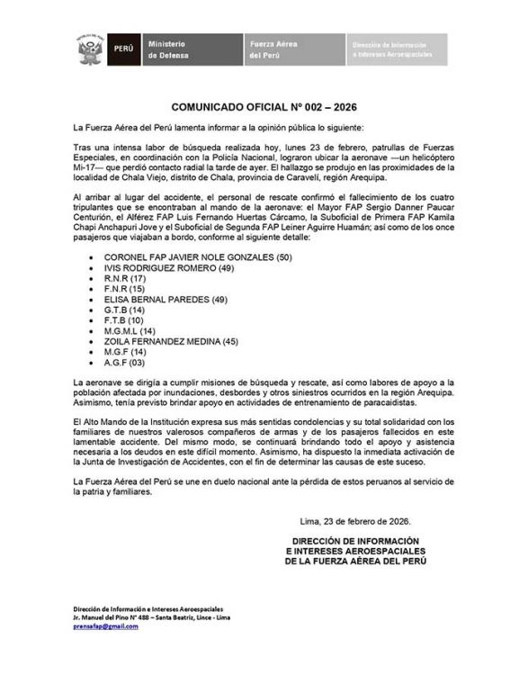 Por último, la Fuerza Aérea del Perú señaló que se suma al duelo nacional por la pérdida de estos peruanos en acto de servicio.