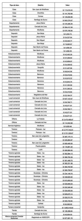 En esta oportunidad se subastarán 61 bienes inmuebles valorizados en S/ 38 104 956, así como un bien intangible identificado como la marca “Cinestar Multicines”, tasada en S/ 1 316 838.