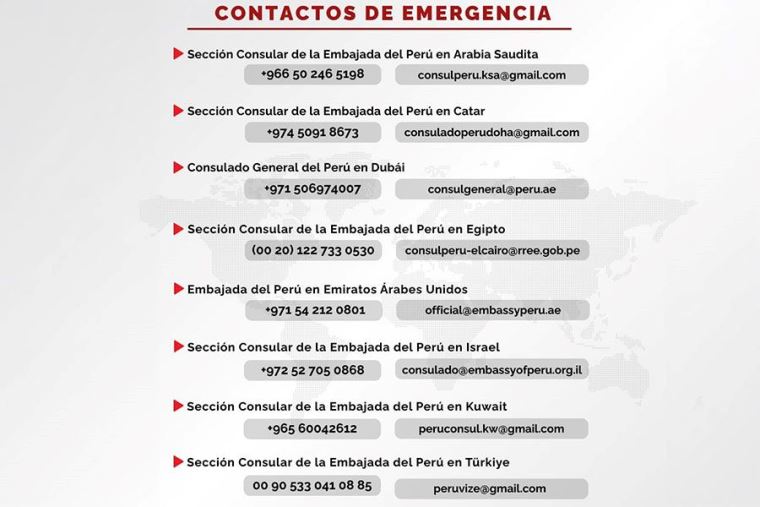 Hugo de Zela informó que solo en Israel se encuentran unos 3,000 compatriotas, 1,000 en Emiratos Árabes y varias comunidades menores en otros países cercanos a la zona del conflicto.