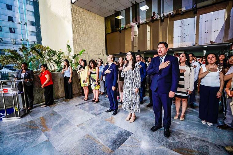En el acto cívico, que rinde homenaje a la patria, se entonaron las notas del Himno Nacional y se resaltó la importancia del patriotismo en el trabajo diario de las funcionarias y los funcionarios al servicio del país.