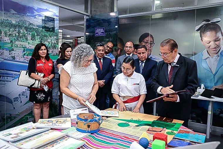 Posteriormente, el ministro Castillo y Rafaella visitaron una exposición de materiales educativos elaborados por el Ministerio de Educación (Minedu) para estudiantes y docentes de Educación Intercultural Bilingüe, entre los que figuraban textos en diversas lenguas originarias.