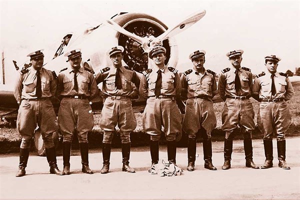 Hombres del aire. Integrantes de la Escuadrilla de Caza 41, a la que perteneció el futuro héroe (derecha), frente a un avión Torito.